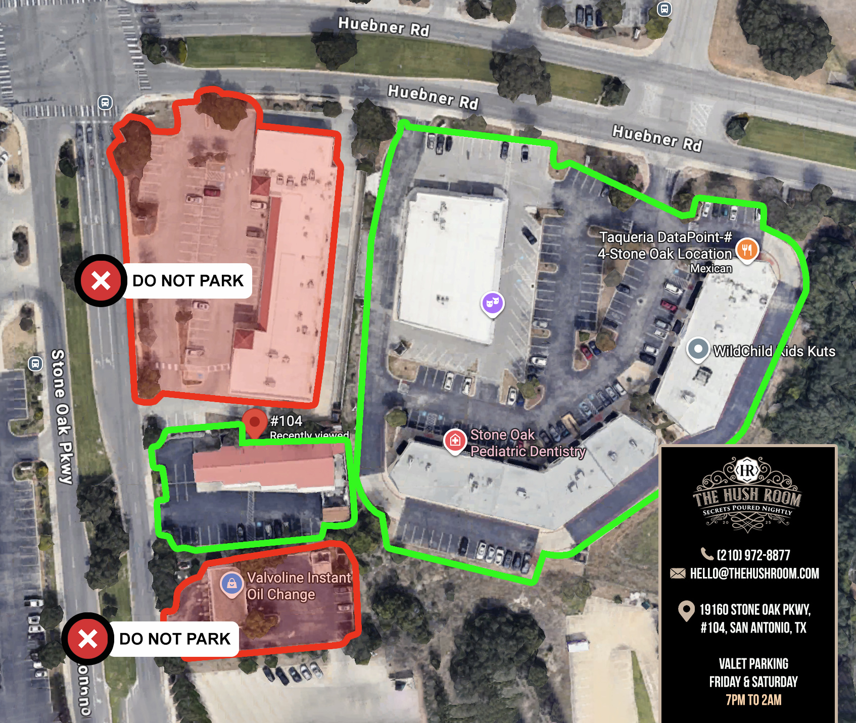 Rear Parking: Additional parking is available behind The Hush Room, with a stairway for guest access.